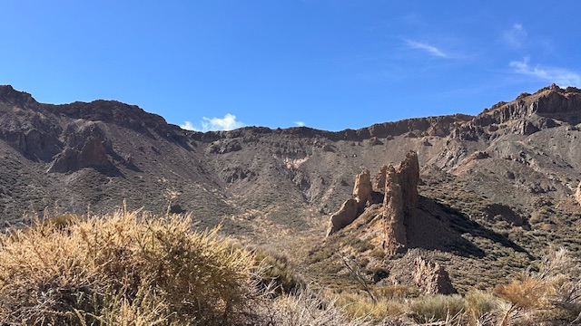 We tried not to overdo it and turned around after 2.5 km; and it was then we discovered why exactly the lift had to close. Once it didn‘t come from behind us, gently helping us move forward but was with force blowing right in our faces, the stroll became a bit more difficult. At a nice point in the landscape we sat down and meditated in this landscape dominated by air and fire – the Teide, after all, is a volcano.